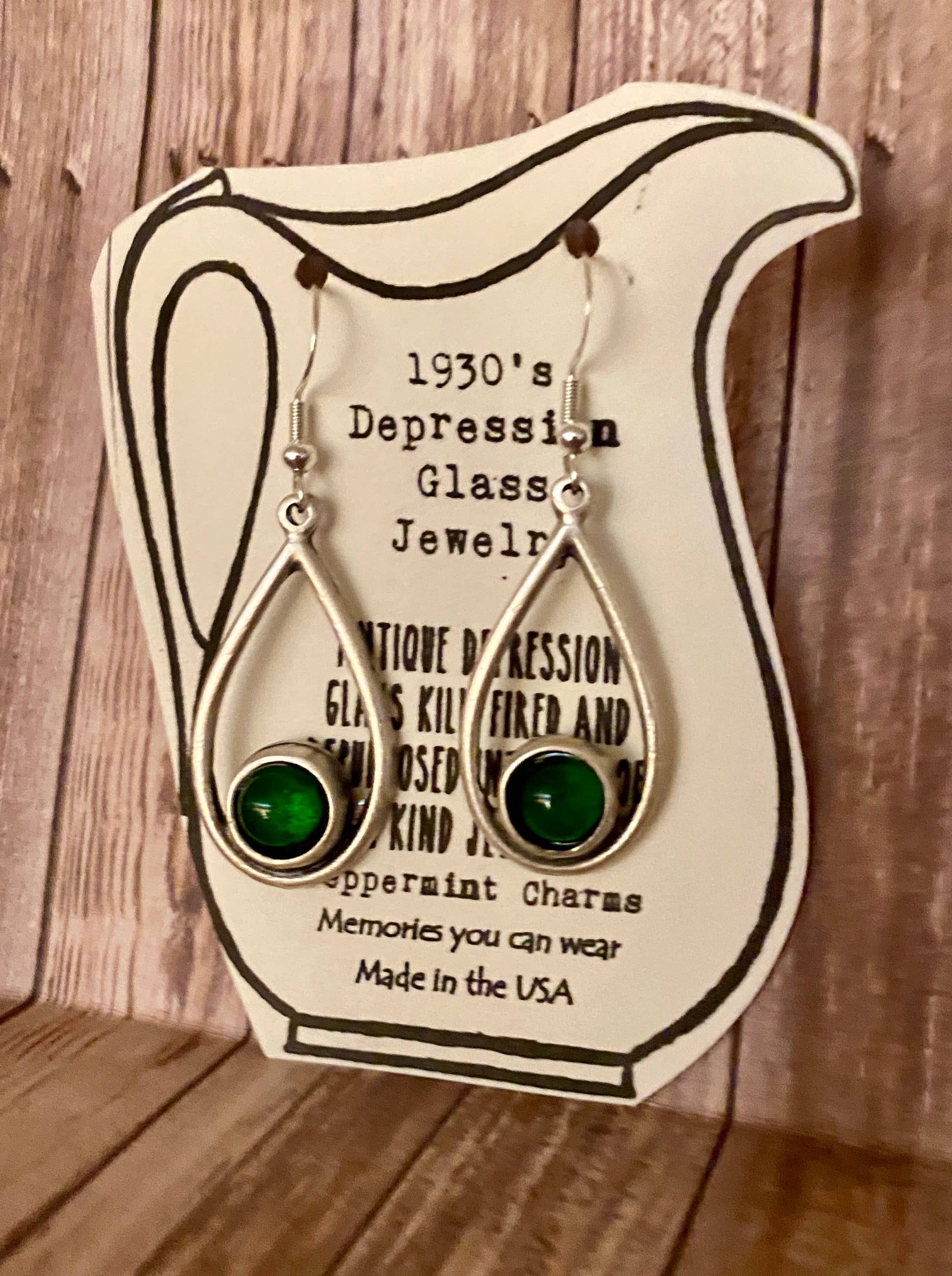 These earrings are made from 1930s kiln-fired depression glass. Sterling silver earring wires. Made in Washington state, USA.