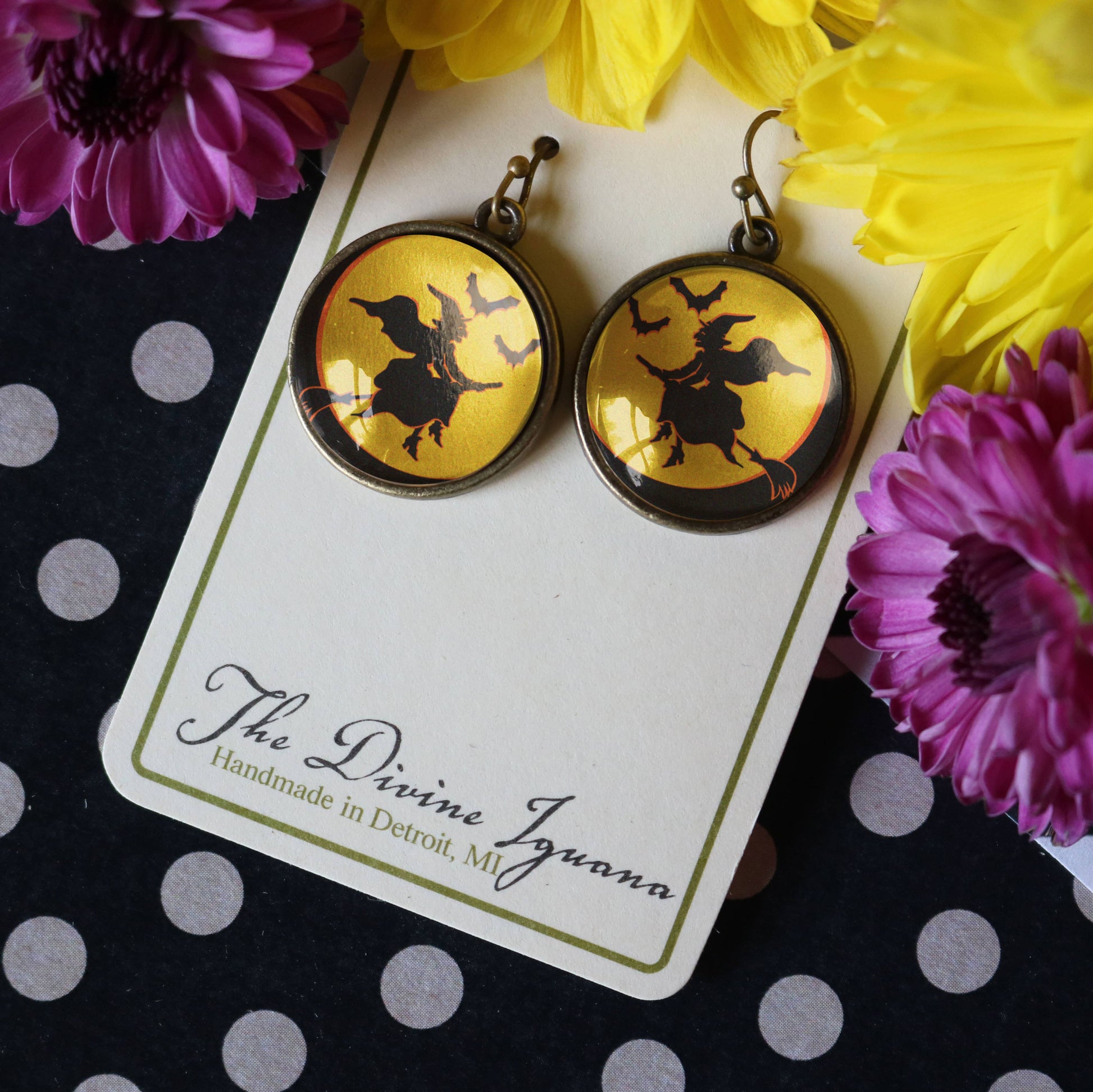 These retro Halloween earrings feature a flying witch silhouette against a full yellow moon. These lightweight earrings have an antiqued bronze finish for a warm, heirloom appearance with lovingly handmade reversed decoupage glass cabochons in elegant base metal findings.